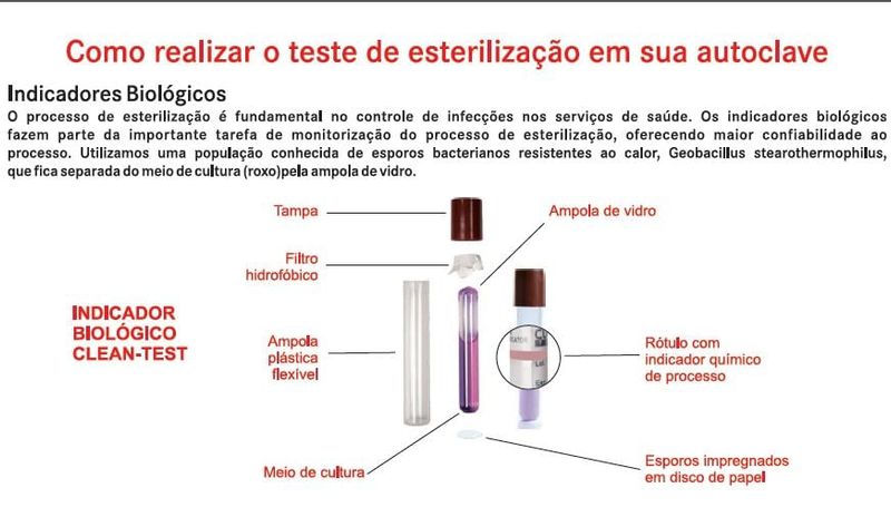 Os indicadores biológicos (IB) CLEAN-TEST são utilizados para monitorar ciclos de esterilização a vapor. Cada I.B. CLEAN-TEST possui um disco de papel inoculado com esporos com uma população mínima de 105 ou 106 de esporos bacterianos de Geobacillus stearothermophilus ATCC 7953. Esse disco é acomodado em um frasco termoplástico que servirá como frasco de cultura. O frasco também contém uma ampola de vidro quebrável contendo meio de cultura caseína de soja. A produção de ácido associada ao crescimento de esporos causa mudança de cor do meio de cultura de roxo para amarelo, facilitando a detecção do crescimento.